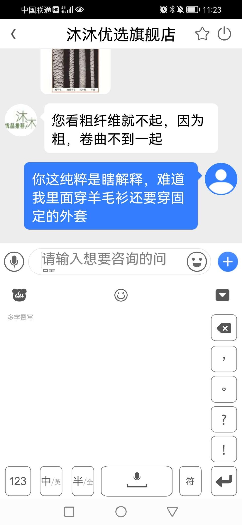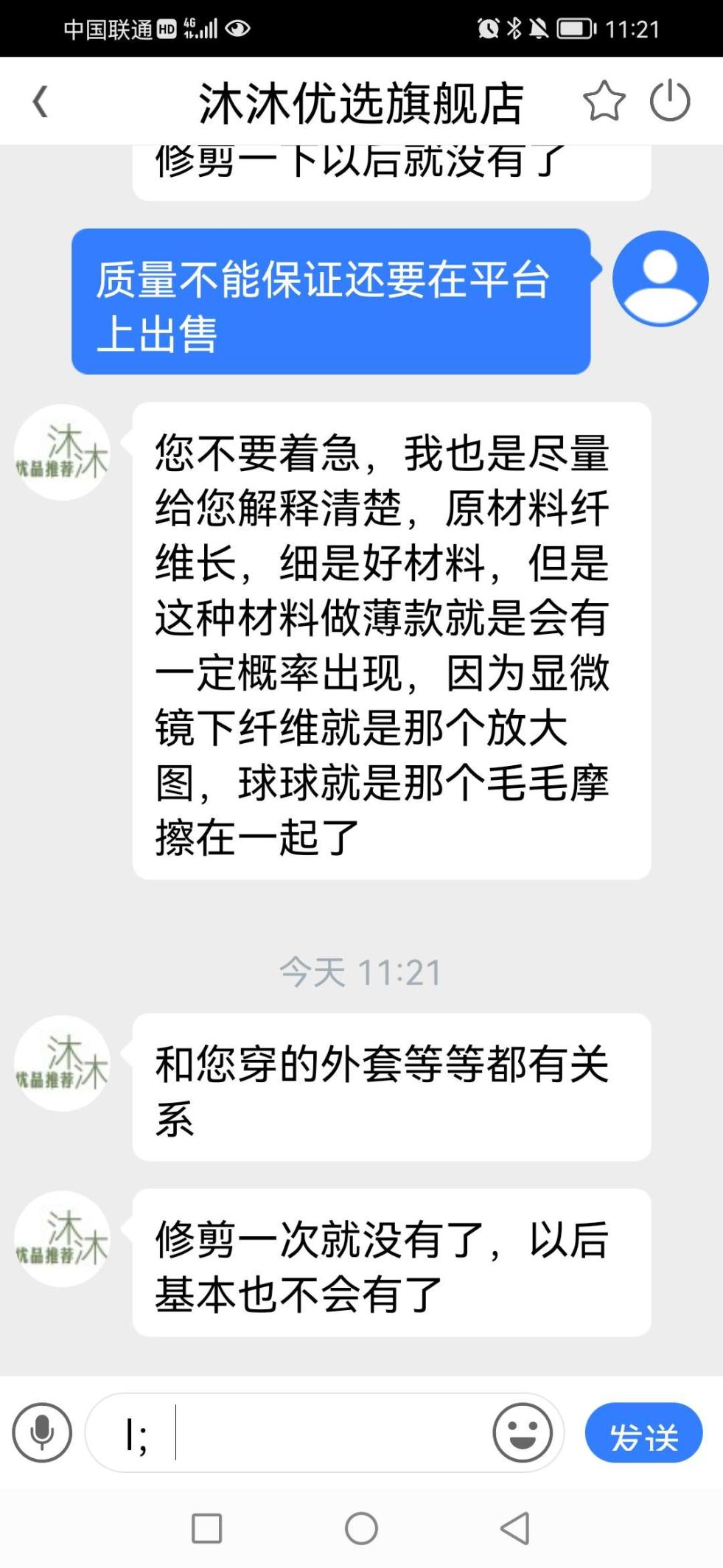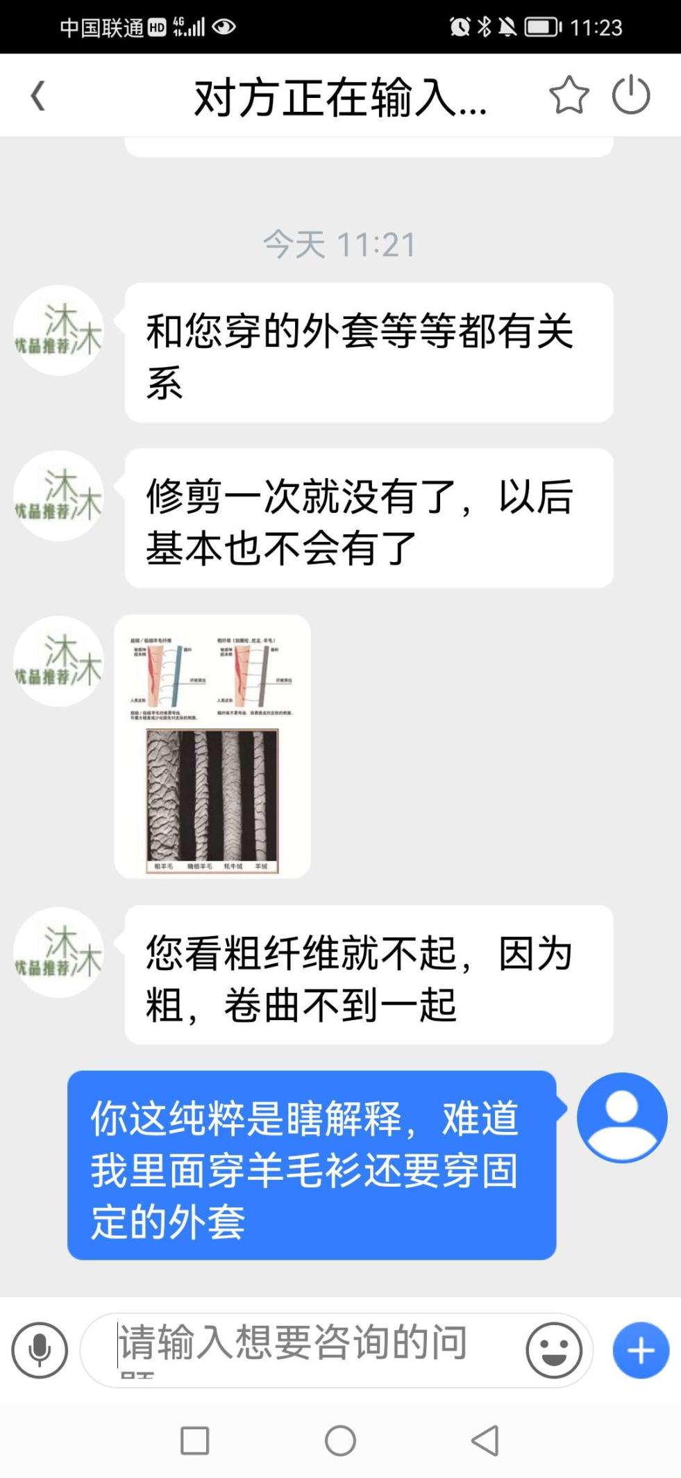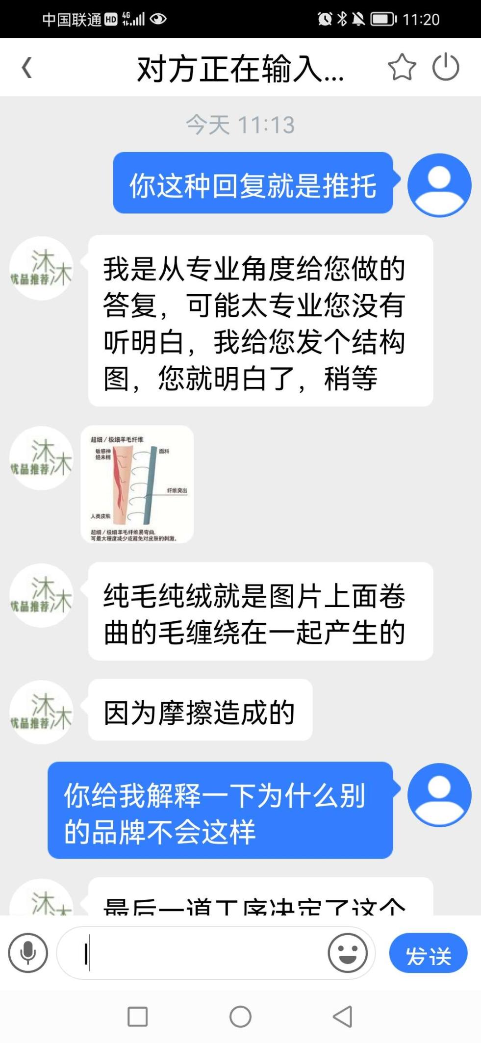 很感谢您能真实的把聊天截图发上来,我们非常耐心细致的进行了讲解,并不是您觉得我们瞎说了我们就是瞎说,我们从专业的角度精细的进行了讲解,就是怕您因为购买商品而不愉快,我们并不担心和害怕差评,因为有声音我们才能进步,并不是因为您评论了我们就要反驳您,我们说的只是事实。纯毛纯绒浮毛浮球是正常现象,因为采用的原材料是超细长绒,并且这个做的是薄款,外面卷曲的毛毛经过摩擦产生的,这个和外套还有突出的摩擦点都有一定的关系,我们的客服耐心细致的给您做了解释,您不满意并不代表您上当了,您购买的这款性价比是非常高的好产品,也不是一两个顾客购买,您的心情我们是可以理解的。我们持续在线为您服务。