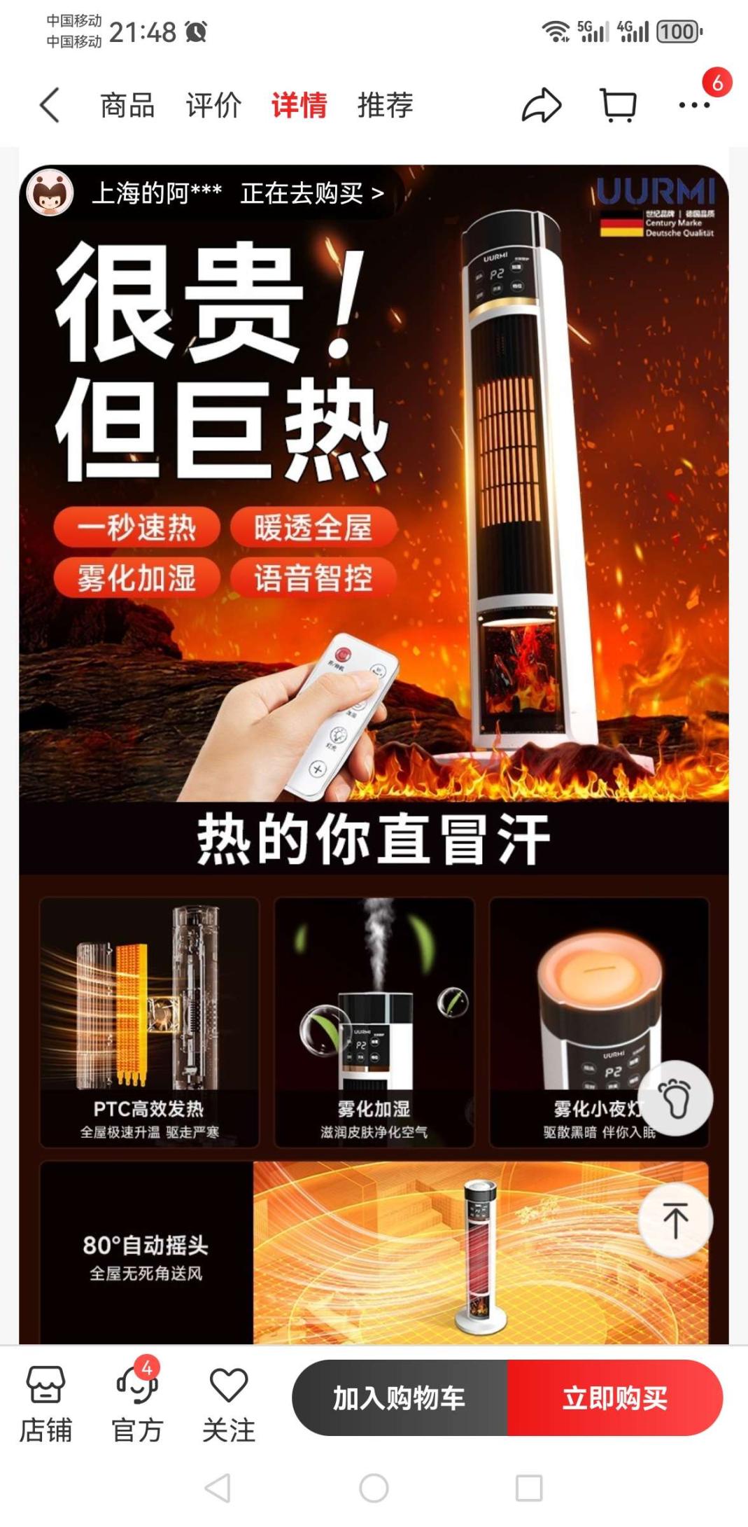 UURMI家的智能塔式取暖器一秒速热,暖透全屋,语音智控,雾化加湿,80度摇头可制热80平房间。