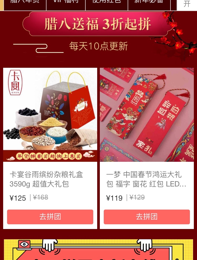 惠买今天发了腊八的活动,真好看,页面喜庆,最开心的就是这几天正好打算买春联,马上过年了,年货都该准备了,上的那款春联礼盒真漂亮,一眼就看上了,明天活动开始就下单,有没有喜欢的明天咱一起约个团呀!