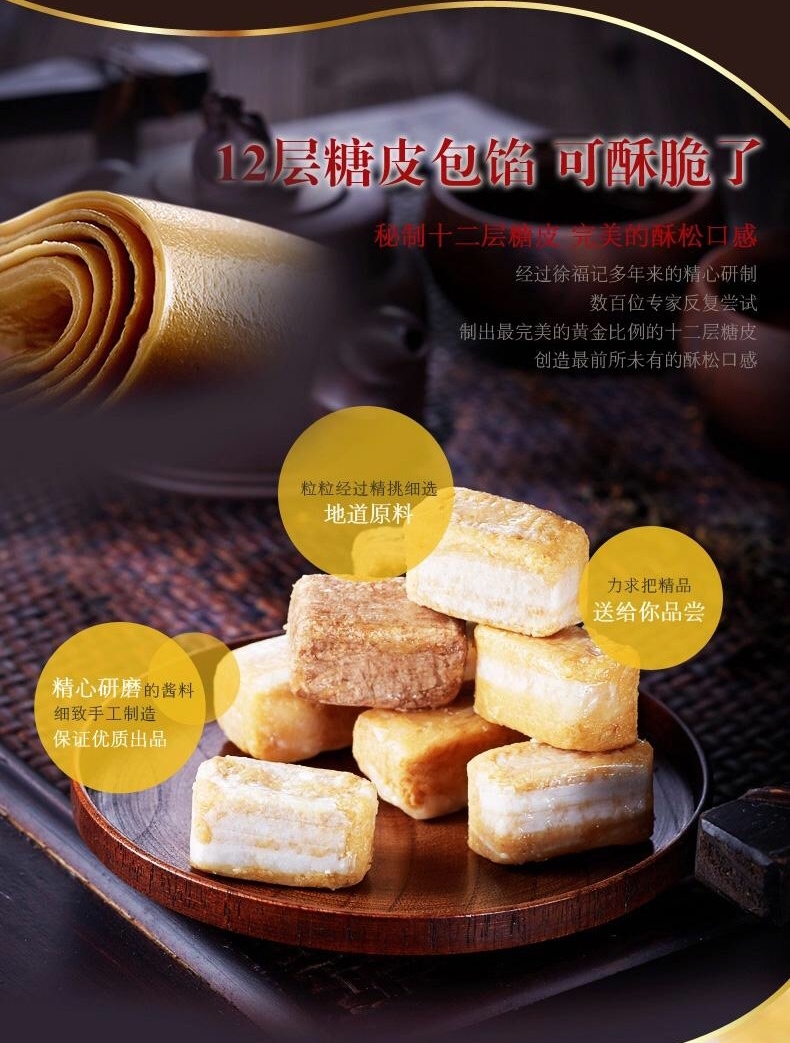 馅料纯正,精选小白沙花生,颗粒饱满 ,火候地道;古法熬煮,散发浓郁花生酱香 ,十二层糖皮包馅,可酥脆了!香气扑鼻,口感酥脆,入口易溶 ,全家老少都爱吃!