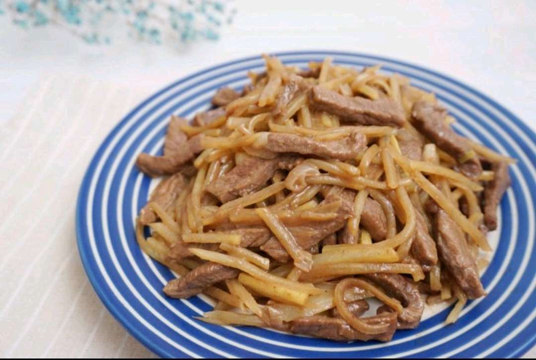 在家做饭我的原则就是既简单又好吃 昨天自己在家,就炒了一个菜,但是好吃到没有更好吃; 今天跟大家分享一下; 20分钟, 10元钱 吃到超级满足; [所用时间]:10分钟 [难度]:绝对初级 [注意]:低盐食品更健康 [食材清单]: 土豆 1个(大) (如果比较小的可能需要2个) 葱白: 2根 姜:2-3片 油:适量即可 盐:一小勺 鸡精:适量(少放或者不放) 生抽:8毫升+15毫升 料酒:少许 淀粉:1勺 烹饪步骤: 1:准备食材 2:土豆去皮洗净,切丝; 牛肉洗净切丝加入少许食盐+8毫升生抽、料酒和淀粉拌均匀(可以手抓均匀);再加入少许油抓均匀后腌制20-30分钟;葱白洗净,切段;姜去皮洗净并切成丝;算去皮洗净切成薄片; 3:土豆丝用清水洗去表面多余淀粉,再用清水浸泡2分钟后捞出沥干; 4:热锅放油,放入牛肉丝,炒至变色后盛出备用; 5:热锅放油,放入葱段,姜丝和蒜片小火煸炒香 6:放入土豆丝和盐,翻炒约2分钟 最后一步:放入牛肉丝、生抽和鸡精,均匀翻炒; 关火、出锅、盛盘
