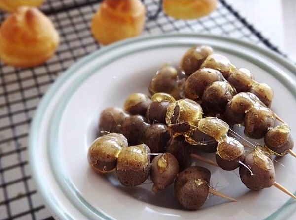 零余子,俗称“山药豆”,有食补作用。其作用与山药大致相同:补肺益气,健脾补虚,固肾益精,益心安神,强志增智,滋润血脉,宁嗽定喘,轻身延年。 它的吃法有很多,例如山药豆糖葫芦、炝炒山药豆、山药豆蔬菜粥、孜然山药豆等。 今天给大家介绍山药豆糖葫芦的做法: 食材明细:山药豆一盘子,白砂糖半包,竹签适量。 甜味口味,拔丝工艺,半小时耗时,做法简单。 步骤 1山药豆蒸熟放凉后用牙签穿好,让每串的大小都差不多,这样好蘸。 2熬糖,大概是糖:水2-3:1,先用大火,期间搅拌,泡泡会从大小不均变得逐渐均匀,出现香味,而且颜色逐渐稍稍发黄,用筷子蘸一下放凉水里在拿出来,香香脆脆的不粘牙就可以把锅端起来,快速的蘸了,要速度,不然糖的火候就过了 3事先准备好的板子上抹一点香油,把串好的山药豆均匀的在糖的上方滚一圈,注意糖不能厚了,然后拍在板子上,凉了就可以吃了。 你学会了吗?那快来试一试吧