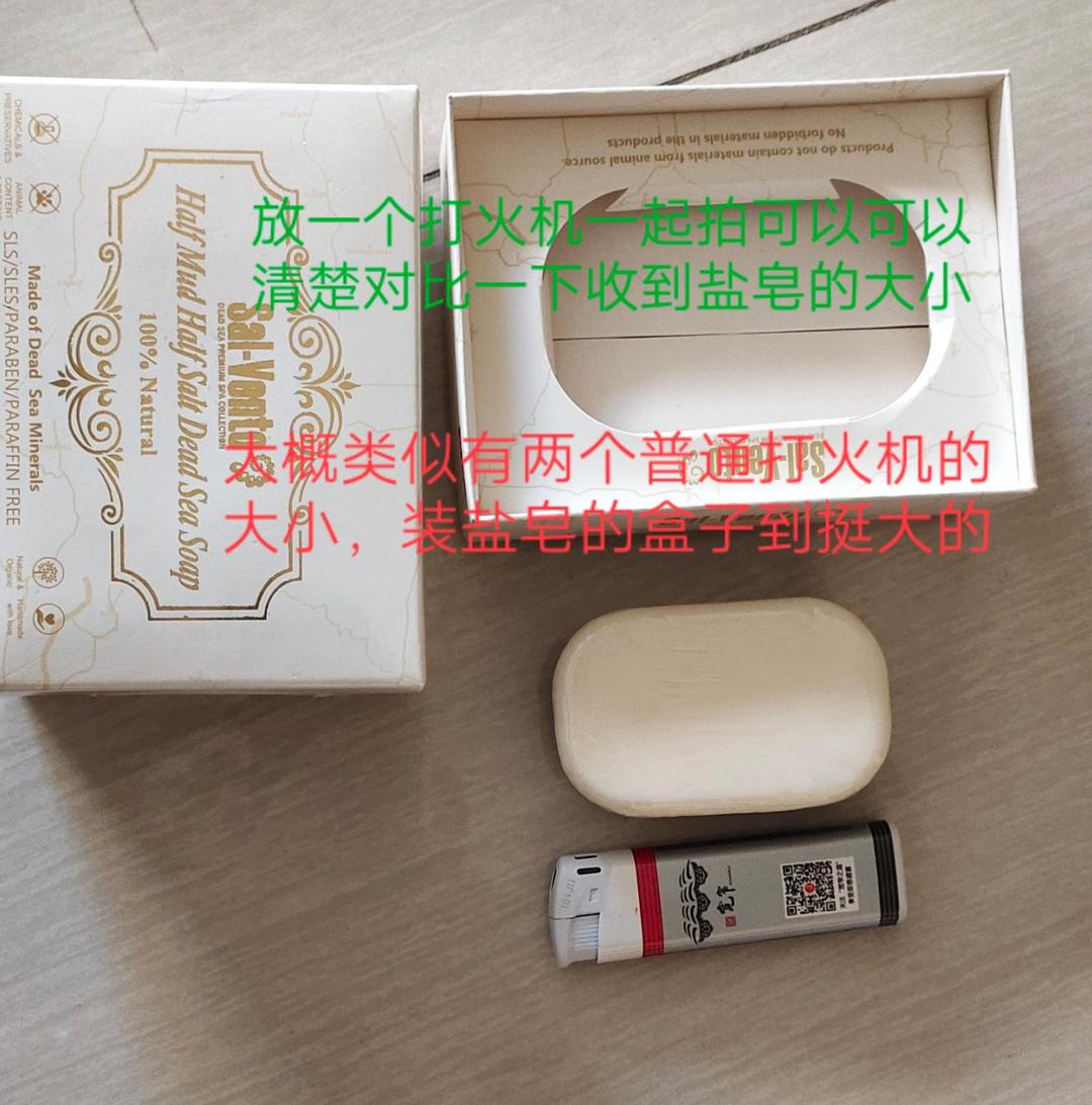 收到的实物盒子挺大里面的盐皂很迷你是盒子的13的大小差不多吧,拍了一些图片放了打火机一起拍有个对比,也能知道盐皂的大概大小,不知道东西好不好用,等用了才能知道,只可惜只能评价一次没办法等用后在追评评价