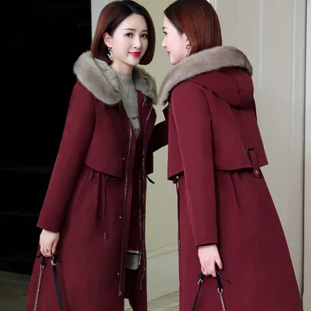 米彩微姿 尼克大衣整貂水貂连帽可拆卸獭兔内胆皮草外套·富贵红