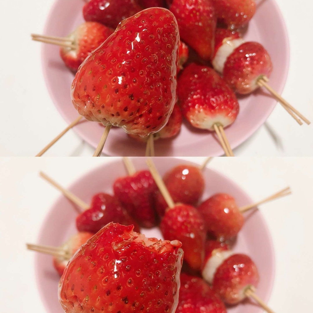 今天自制草莓糖葫芦🍓 白糖和水2:1熬浓稠 竹签穿着草莓蘸糖水不停转动,挂糖均匀 晾凉10分钟。OK啦~