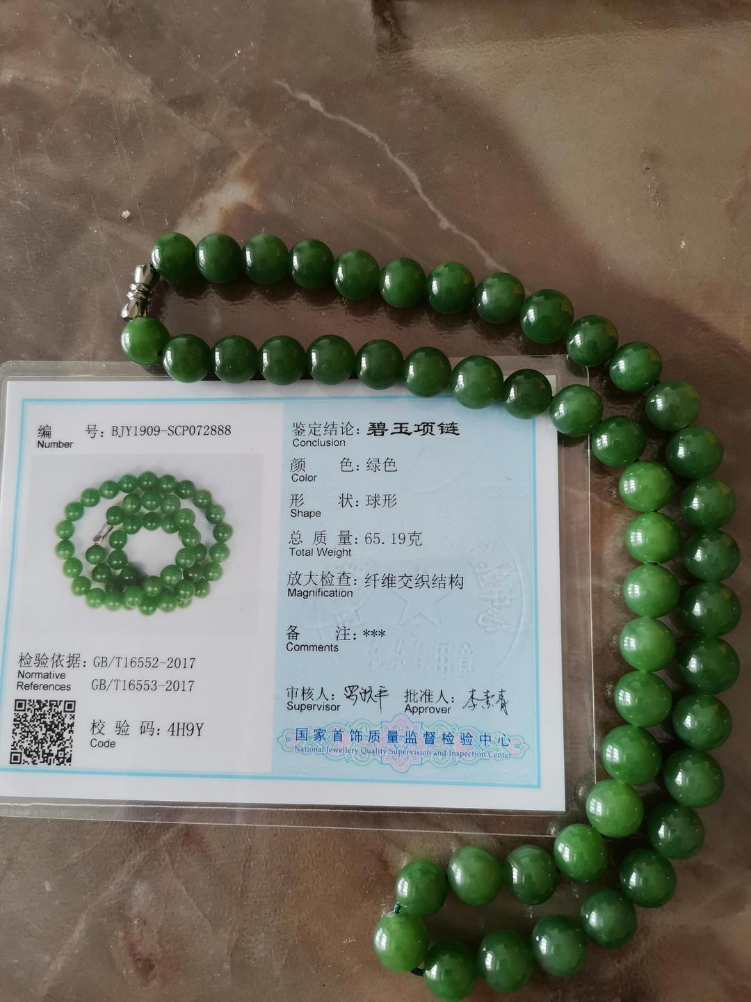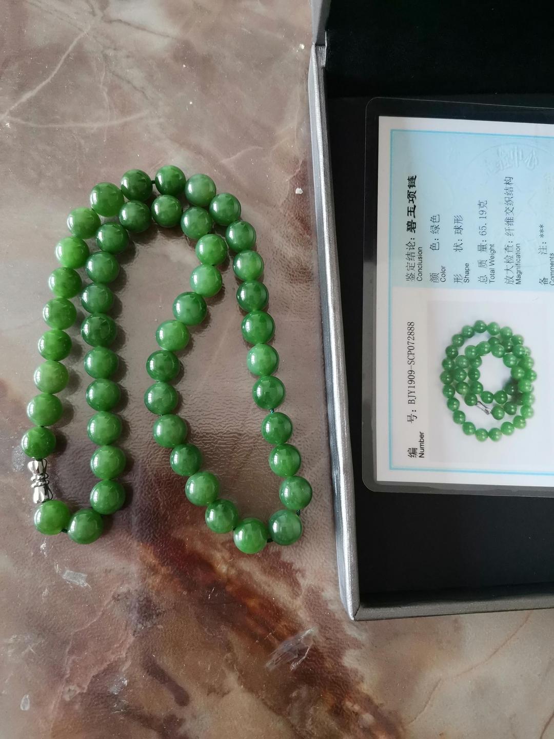 串珠项链已经收到,无黑点七号坑碧玉,颜色辣绿。串珠项链油润靓丽,堪称绿羊脂,非常喜欢,值得收藏、传承。