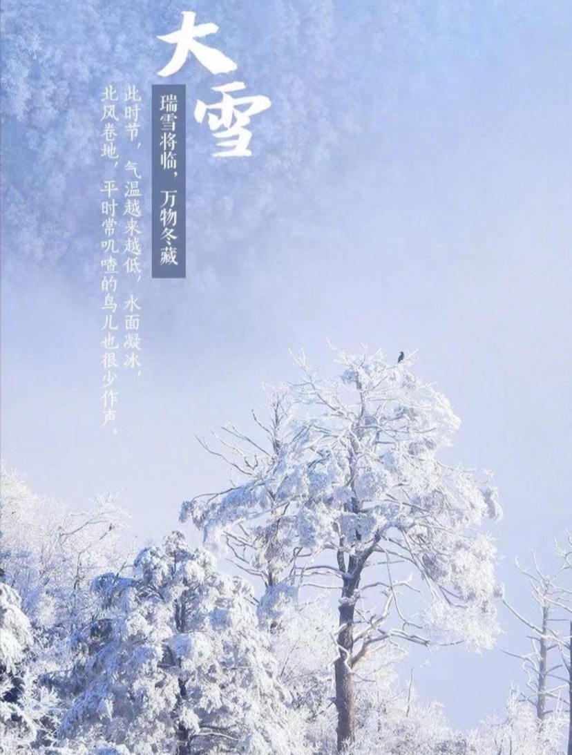 ①今日零时9分迎来“大雪”节气,标志着#仲冬时节正式开始#。②此时节,天气会比“小雪”节气时更冷,下雪的可能性也比“小雪”时更大。③气温越来越低,水面凝冰,北风卷地,瑞雪将临,万物冬藏。④冬日景象丛生,雾凇挂满枝,片片雪花飘。大雪至,新年也不远了,你期待吗?