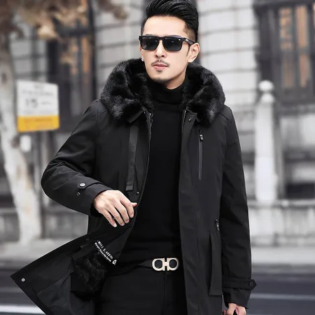 米彩微姿 男士水貂连帽可脱卸水貂内胆派克服中长款领导装·黑色