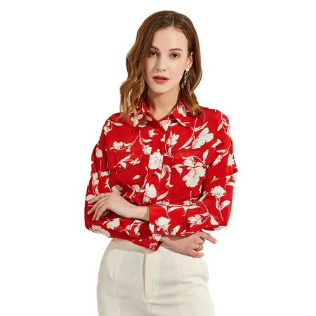 丁摩 真丝衬衫女时尚印花桑蚕丝衬衫上衣Q121006·红色
