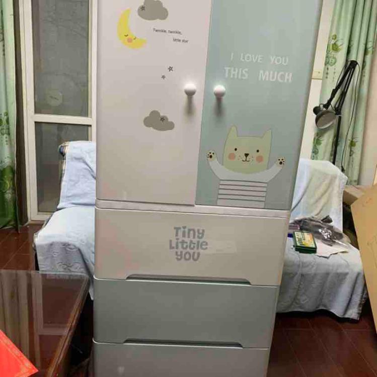 这个柜子不错,三大抽屉,可以装不少东西,上面的开门打开还能挂衣物。虽然是塑料,但材质很好。安装简单