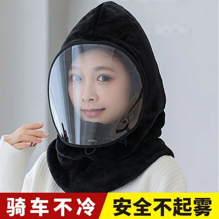 男女同款全脸防护镜片可拆防雾法兰绒围脖连体帽子·光板黑色