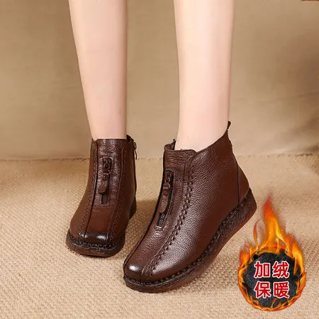 头层牛皮加绒保暖牛津软底侧拉链时尚短靴·棕色