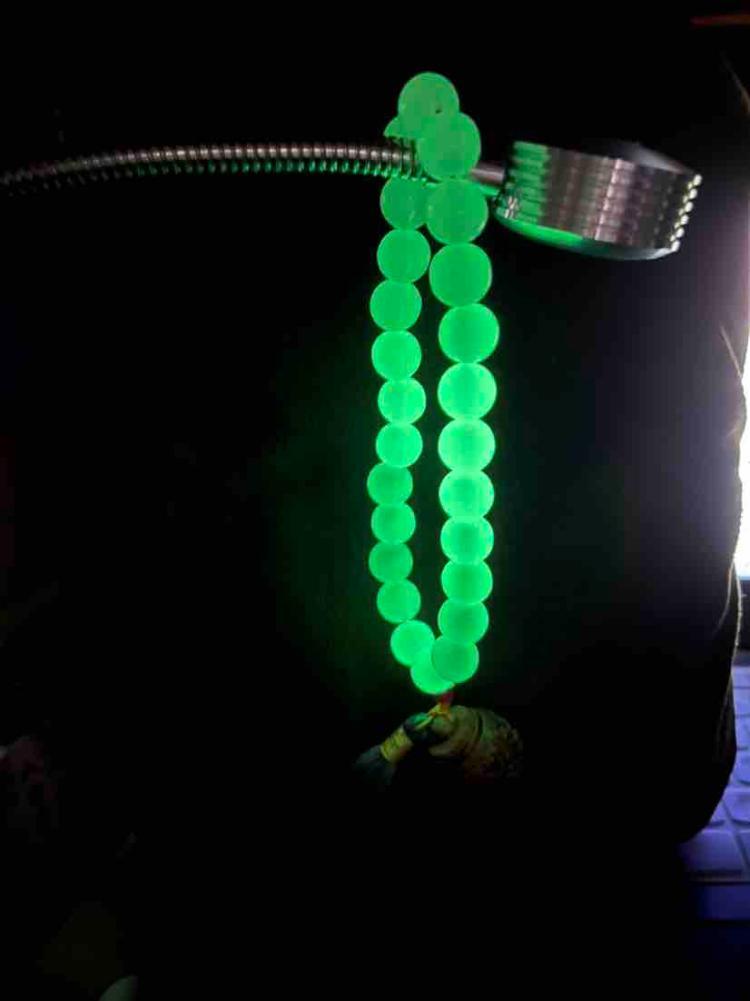 夜光石十八子手把件香囊:已经买了一圆一方两个夜光石香囊后的又一次剁手。拜倒在它的颜值下。黑暗中的莹莹绿光美不胜收。最爱!