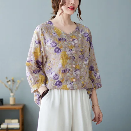 絮笈棉麻碎花盘扣上衣+阔腿裤套装·淡紫花