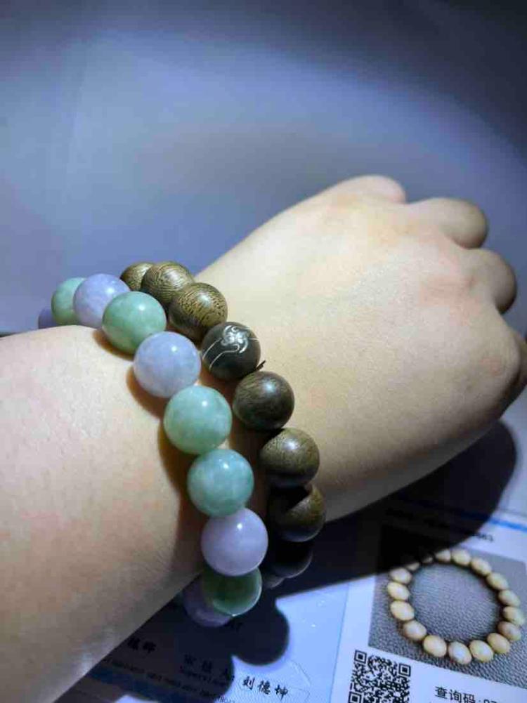 沉香手串:产地加里曼丹,矬银工艺,祥云图案,奶香怡人,与翡翠叠戴,一木一石,一温一凉,非常和谐。