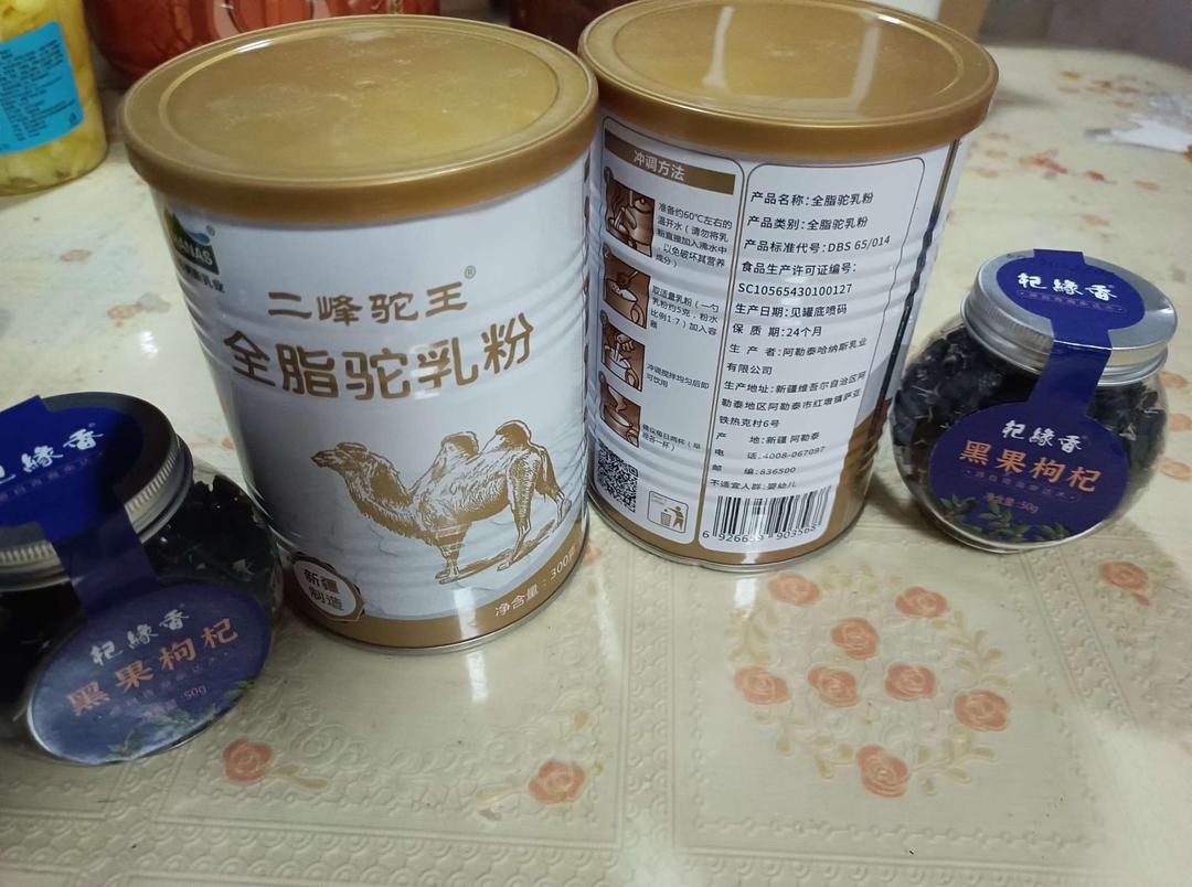 哈纳斯乳业新疆纯骆驼二峰驼王全脂驼乳粉收到,生产日期新,乘活动价格便宜购买了两瓶,先试喝如果口感沌的话,吃完还会继续购买,谢谢厂家赠送了两瓶黑枸杞