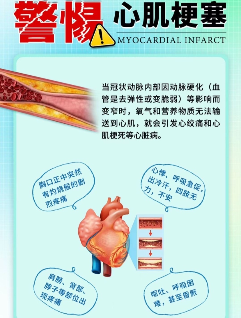 ⚠️秋冬季,警防心梗来袭‼️ ➡️秋冬季节气温下降,易刺激血管收缩,增加心脏负担,心梗发病率明显上升,心梗具备“四高一多”的特点,往往危及患者的生命! ✅身体出现这四大异常,可能是心梗前兆,一定要提高警惕‼️
