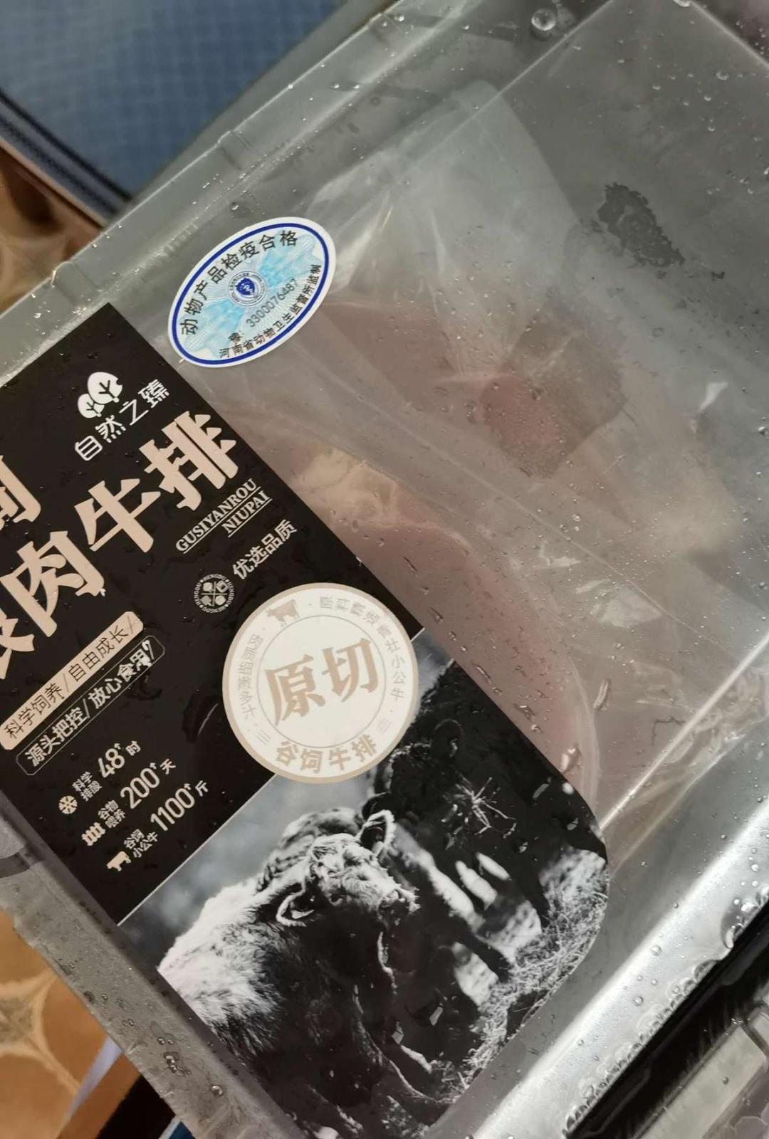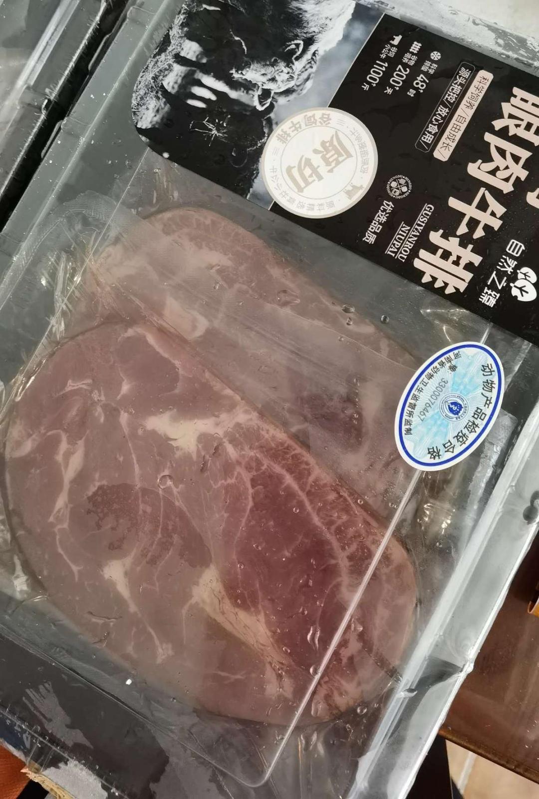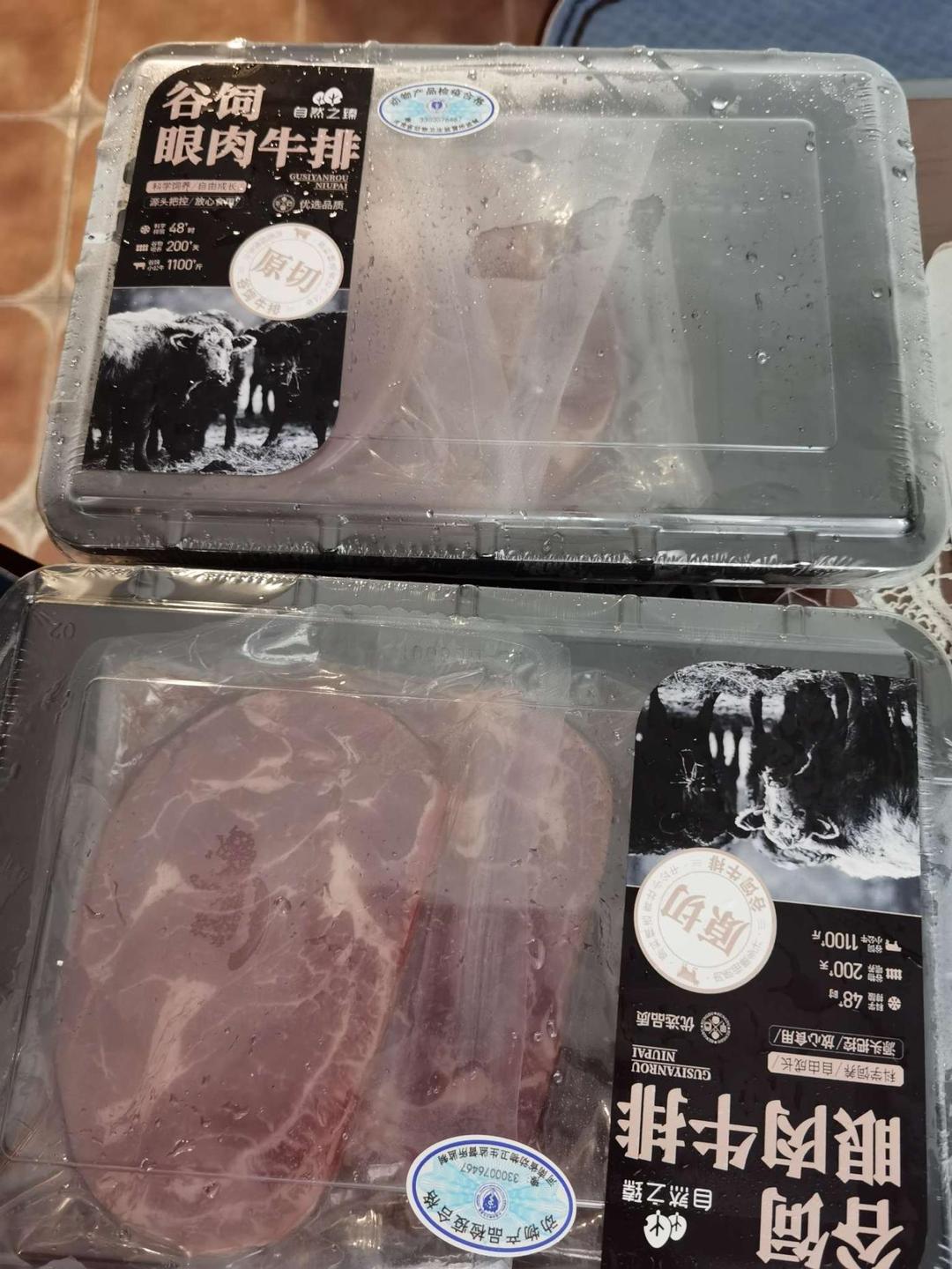 牛排发货很快,冷冻不化,谷饲牛眼肉,口感不错,直播间两单更合适。
