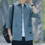 红览 纯棉七分袖衬衫男士港风休闲工装纯色衬衣外套Q622 H·豆绿