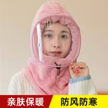 男女同款全脸防护镜片可拆防雾法兰绒围脖连体帽子·光板皮粉
