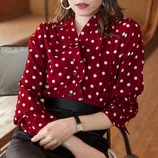 丁摩春夏新款酒红色衬衫立领波点真丝衬衫·红色